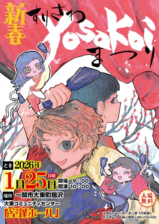 さて、2026「新春すりさわYosakoiまつり」を、下記の日程にて開催致します。前回の皆様とのお約束を果たすべく、おもてなしの心で準備を進めております。兄ちゃん姉ちゃん騒ぎ出し、父ちゃん母ちゃん歌い出す。じいちゃんばあちゃんは腰を伸ばして楽しみましょう。よさこいは最高のコミュニケーションです。チームの繋がりが未来のよさこいへと繋がることを期待しています。